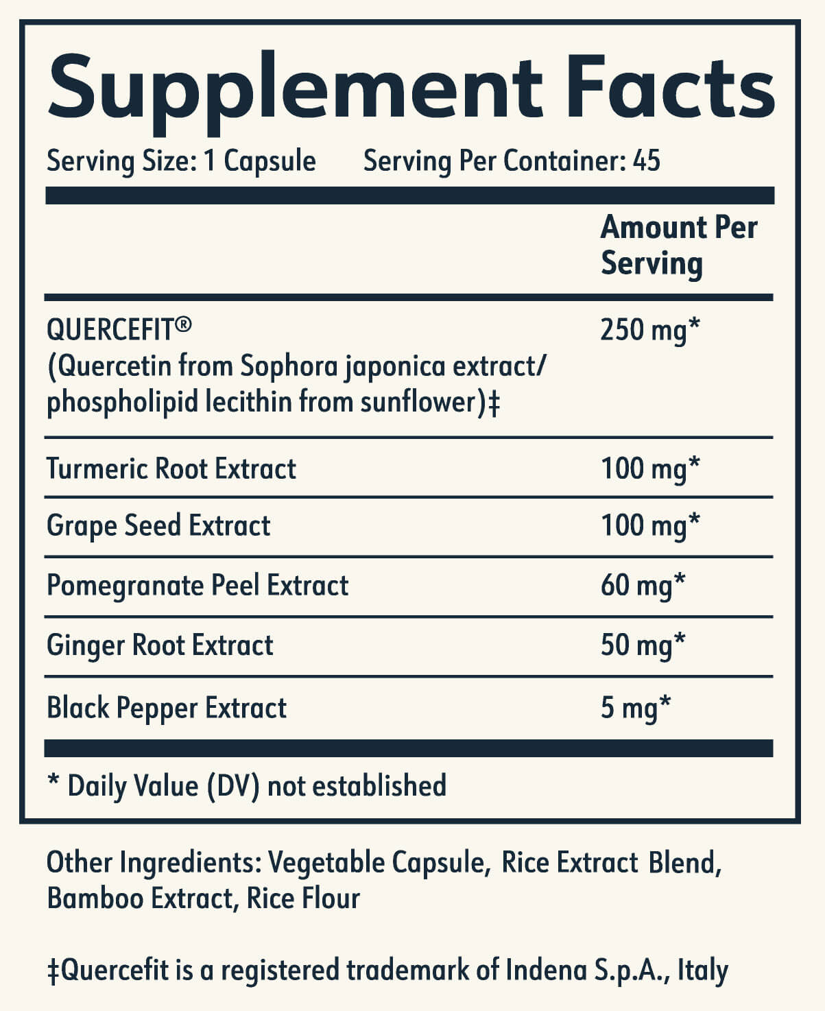 The revolutionary plant-derived compound Quercefit™ is shown to support your body's normal response to free radicals, inflammation, and histamines. Meanwhile, other natural defenders, like turmeric, ginger, and pomegranate, strive to achieve physiological balance.