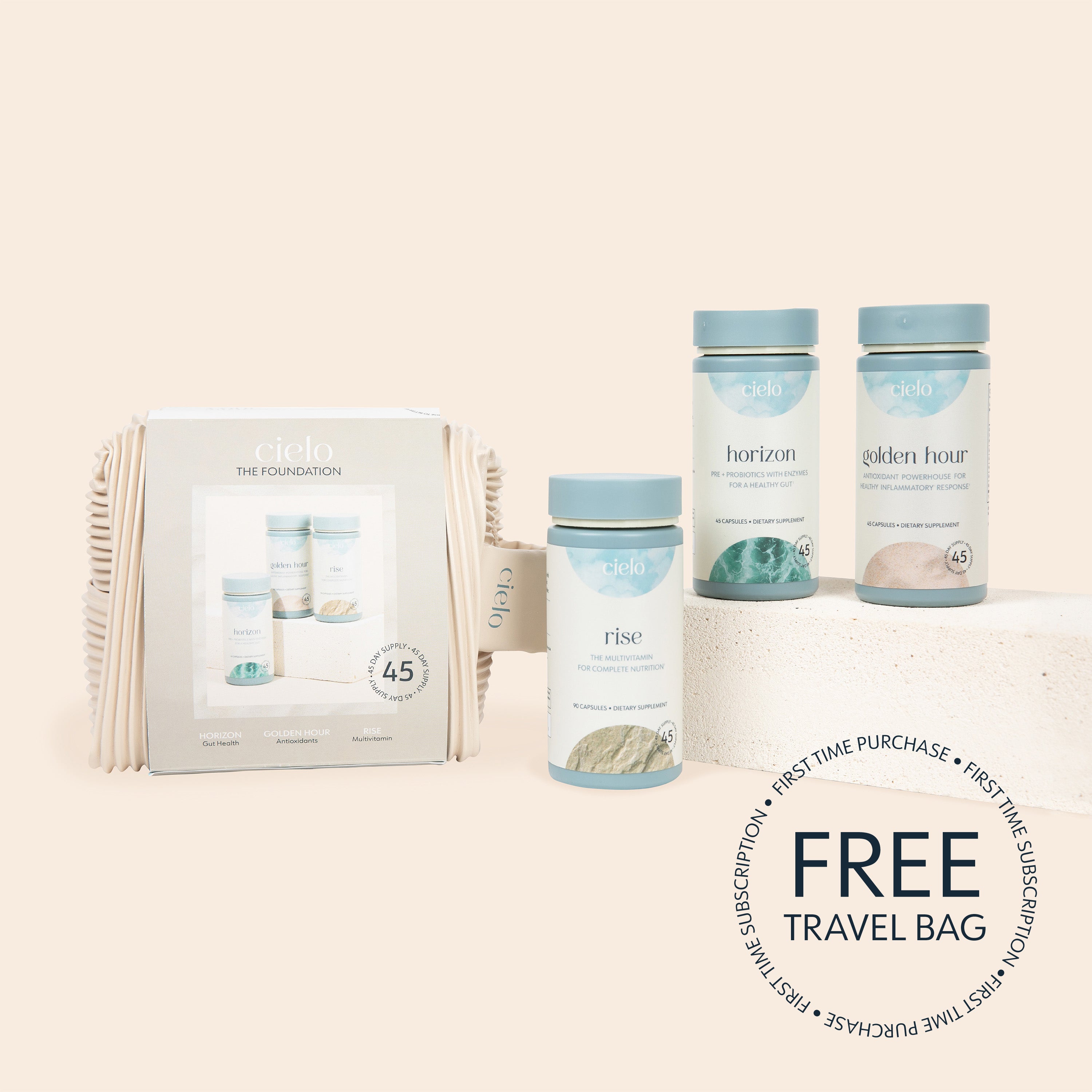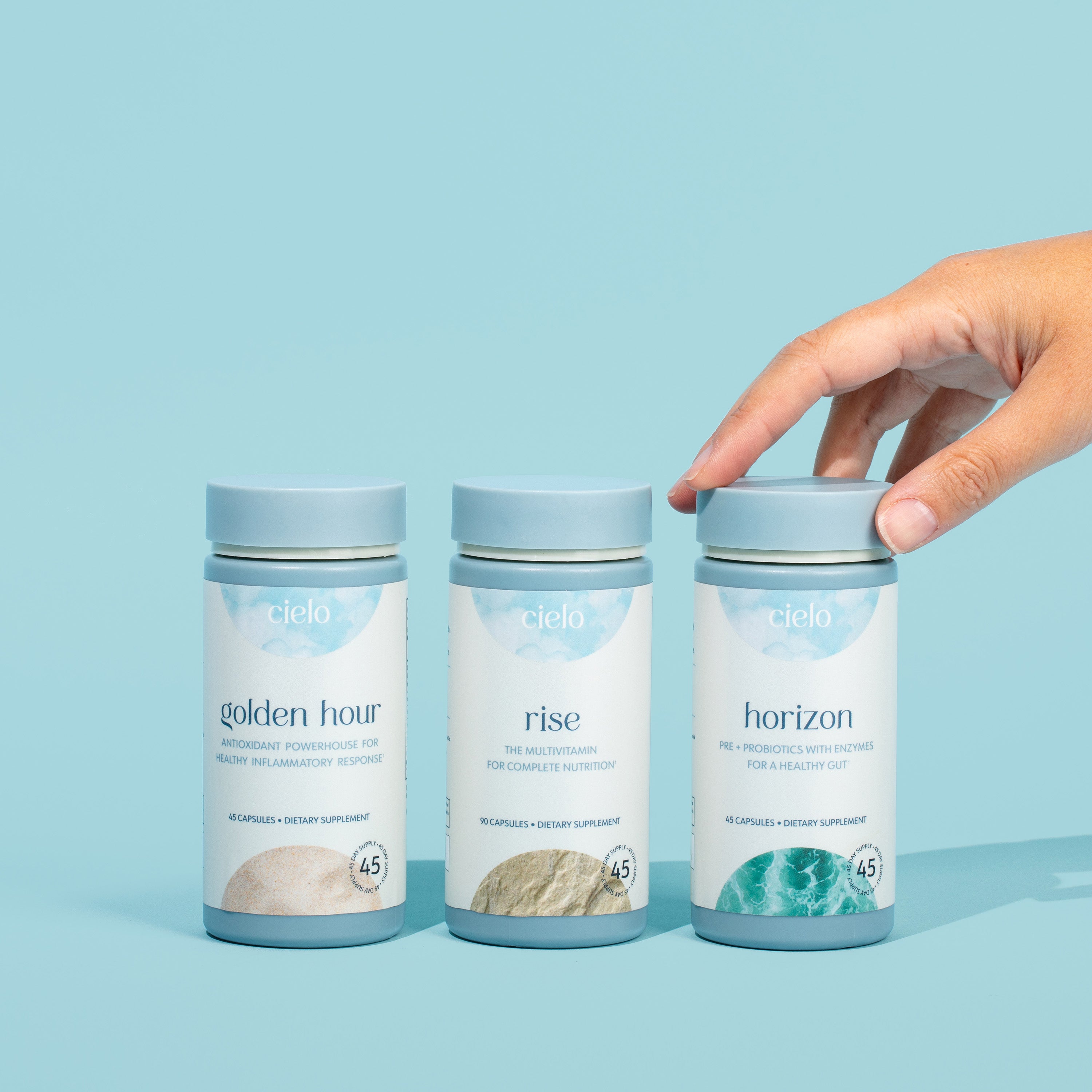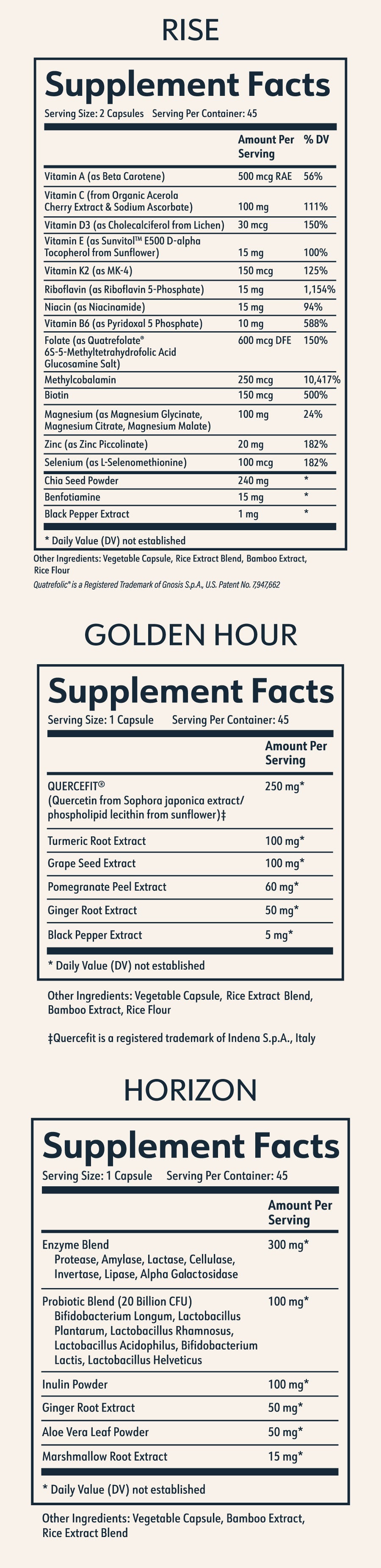 Explore new boundaries for whole-body health with our three signature supplements: rise delivers essential nutrients where your diet falls short, horizon works to balance the gut and improve digestion, and golden hour is here to strengthen your body's natural defenses.